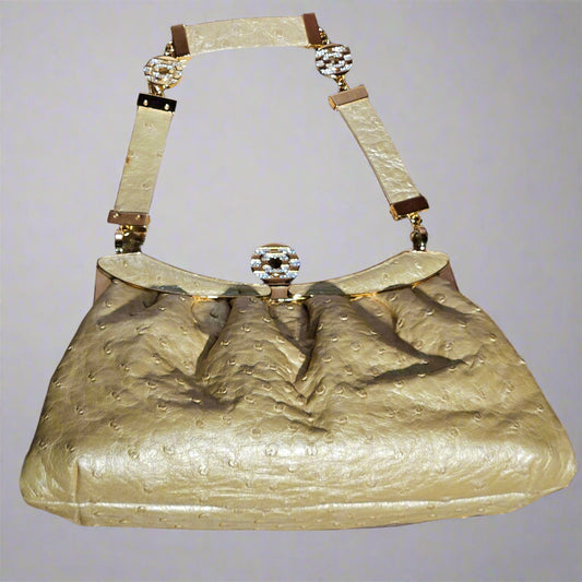 Loved By Lea: Bvlgari Vintage Crystal Logo Frame Bag in Gold Ostrich Leather