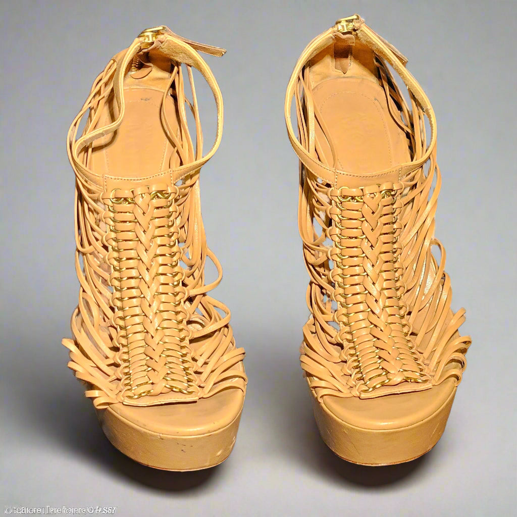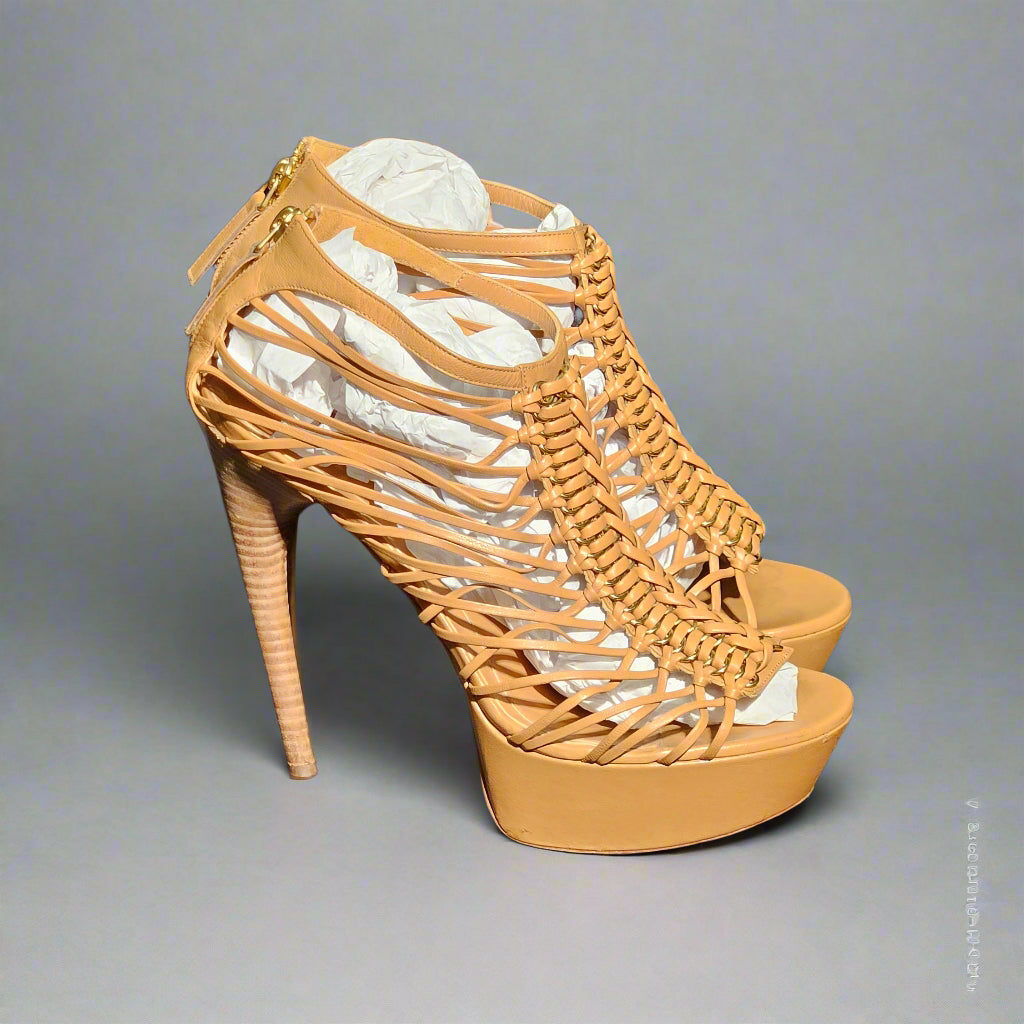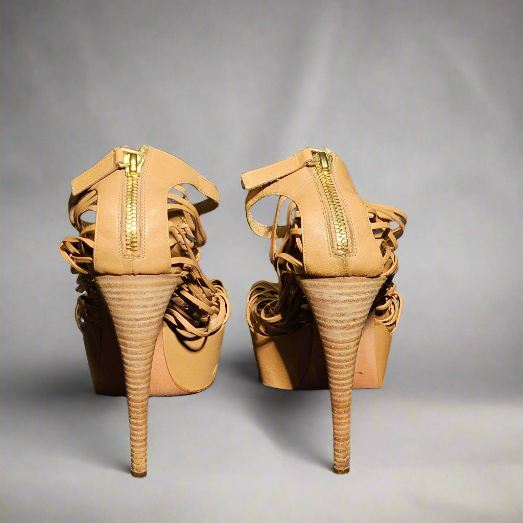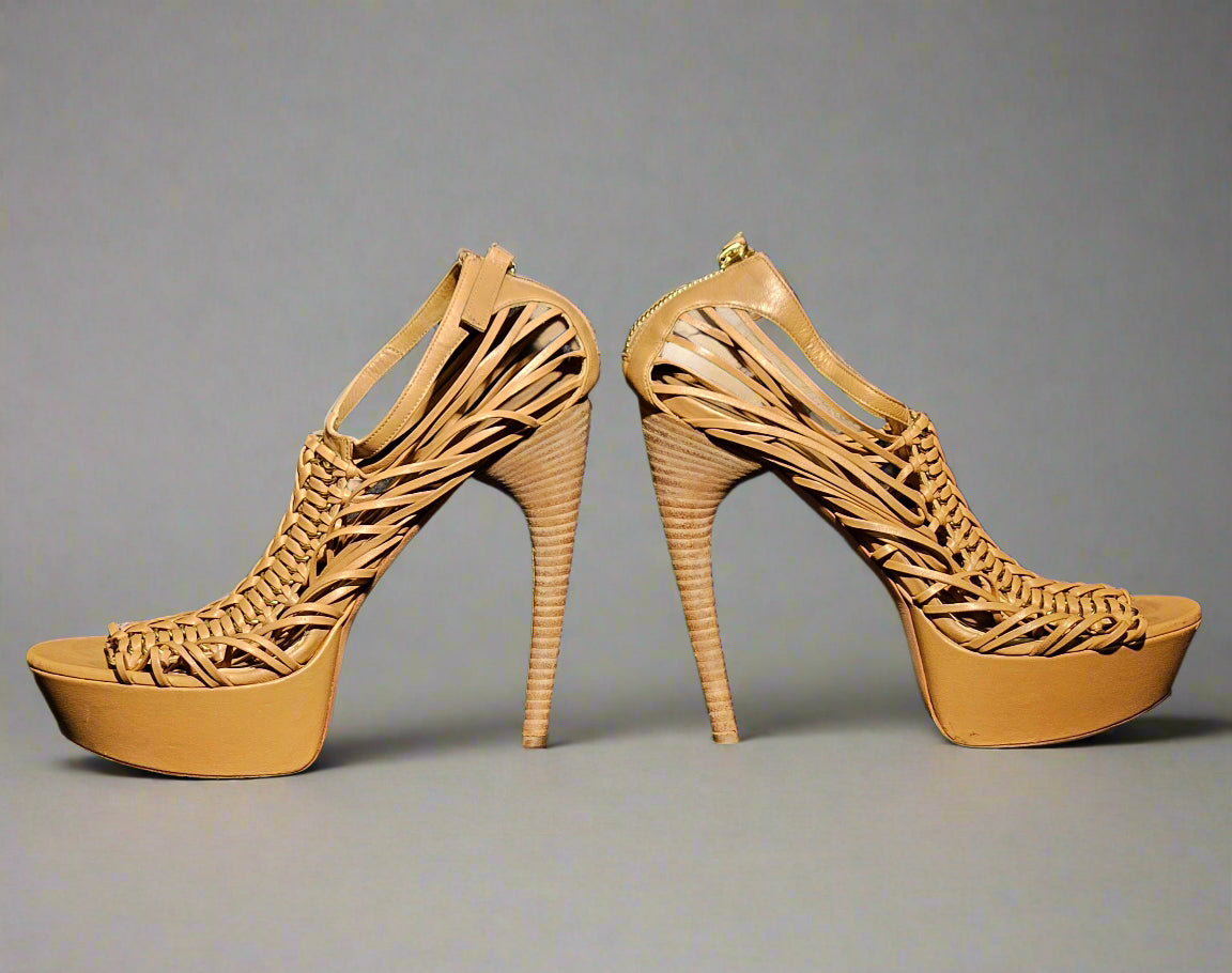 Loved by Lea, Alexander McQueen, Sarah Burton, resort 2012, McQueen heels, nude heels, tan heels, strappy heels, platform heels, 5.75 inch heel, 1.5 inch platform, women's designer shoes, size 39, us 9, pre-loved, preloved, very good condition, b grade, authentic