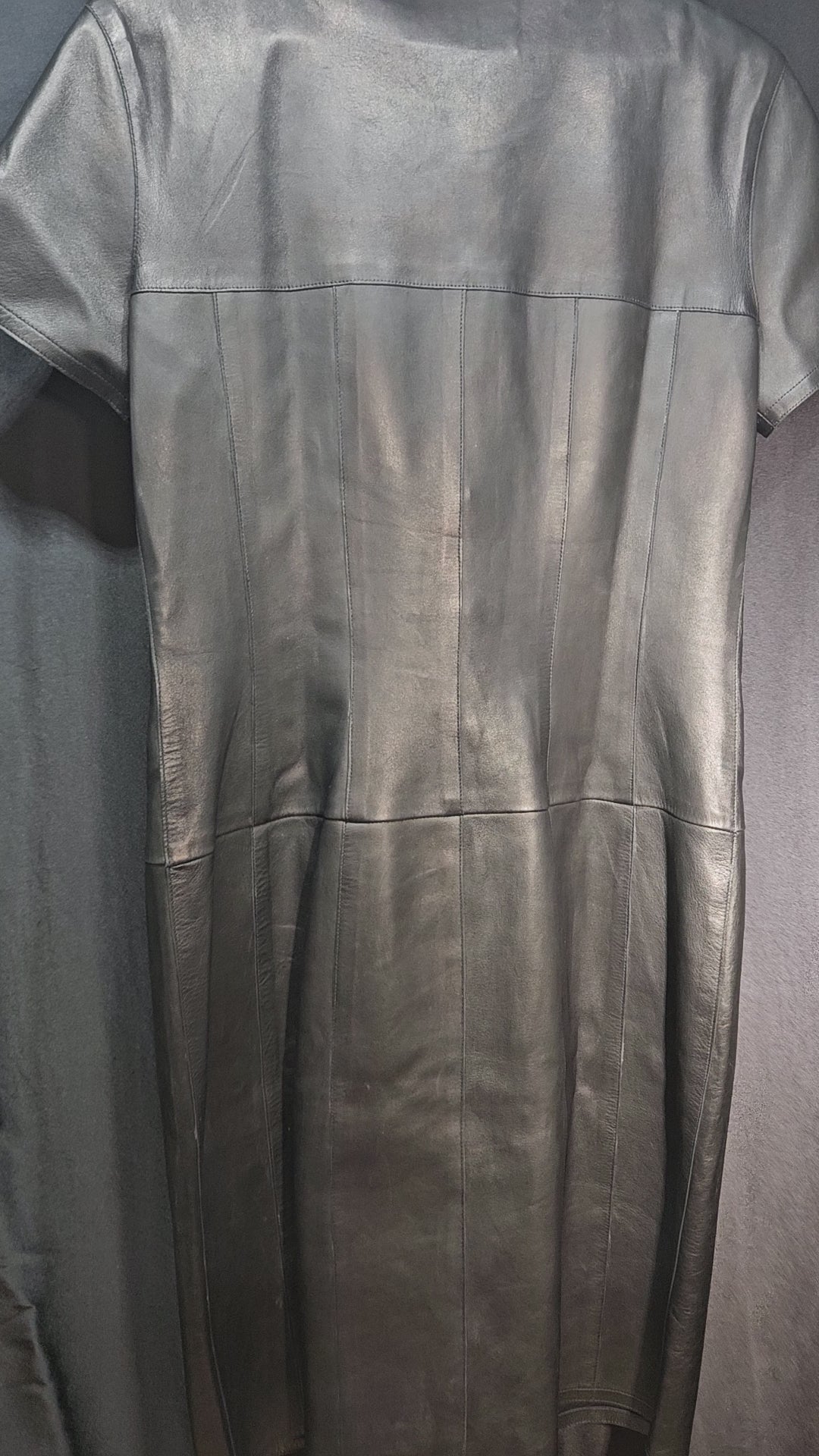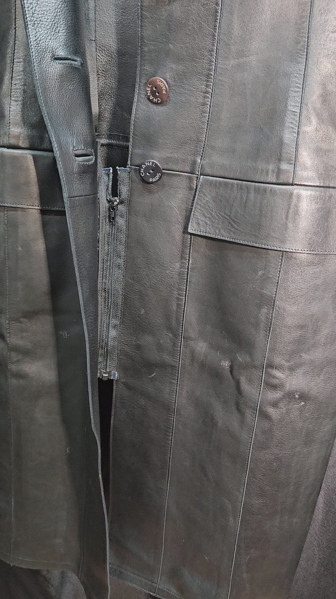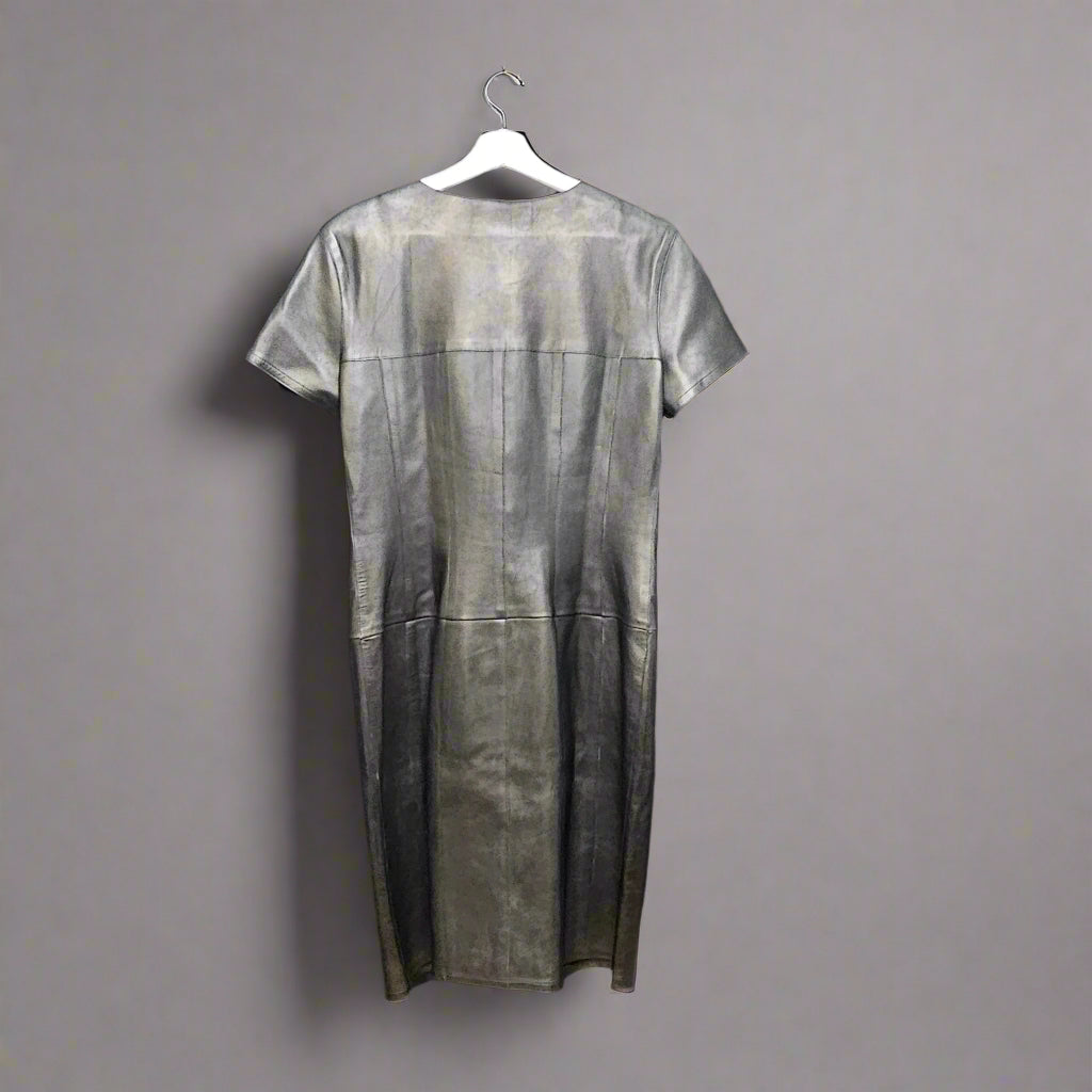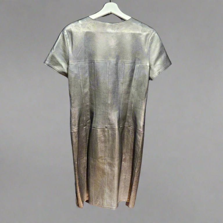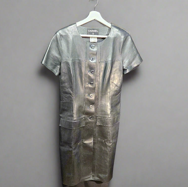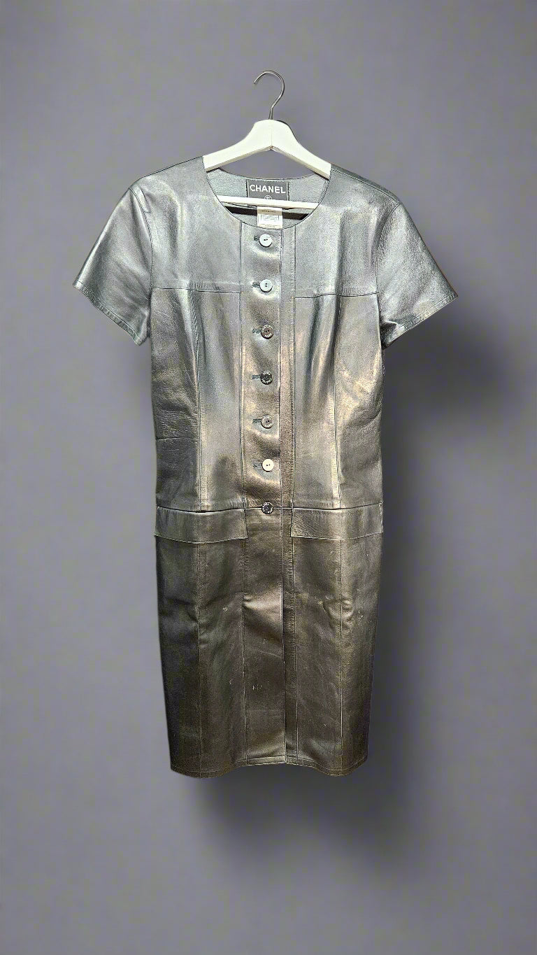 The ultimate little black leather dress—supple lambskin, iconic CHANEL buttons, and a clean, modern cut that layers like a jacket and wears like a dress. A rare 99A piece with enduring value and edge.