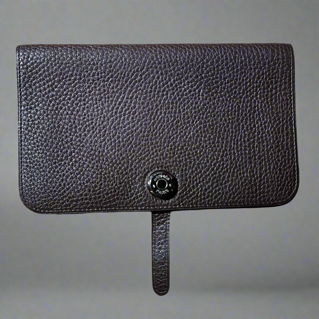 Elevate your accessory game with this authentic Hermès Dogon Duo Combined Wallet, part of the exclusive Loved By Lea collection. Crafted from soft, textured Hermès leather, this wallet features a removable coin pouch, multiple card slots, and full-length bill compartments secured by the iconic Clou de Selle snap closure. Two pieces.