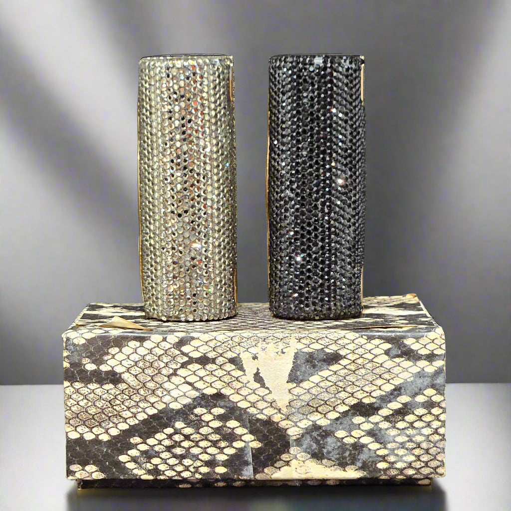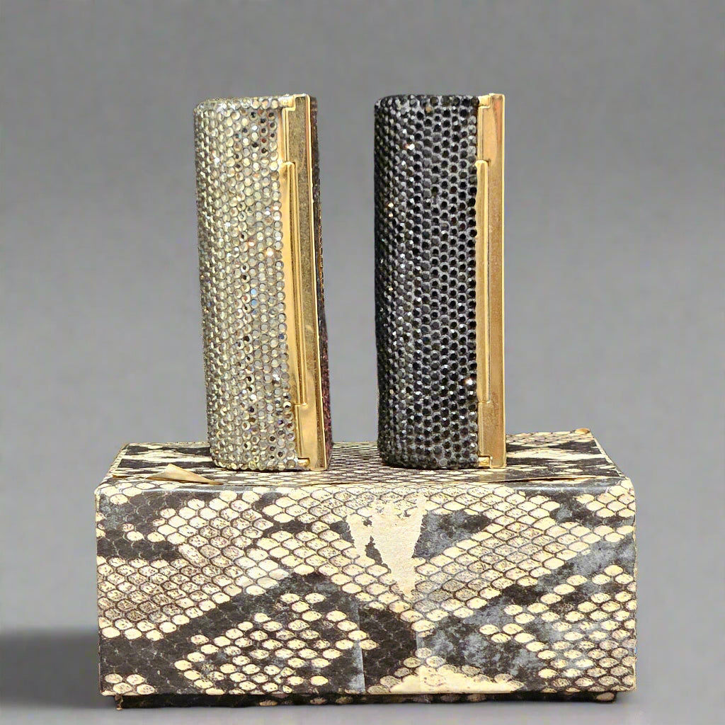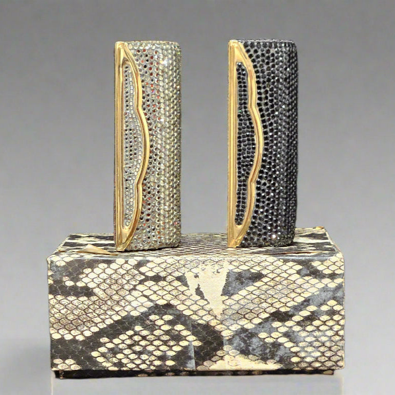 Add a touch of couture glamour to your collection with this dazzling Judith Leiber crystal lipstick compact set. Sold as a pair, these iconic pieces are a celebration of elegance, artistry, and timeless sparkle.