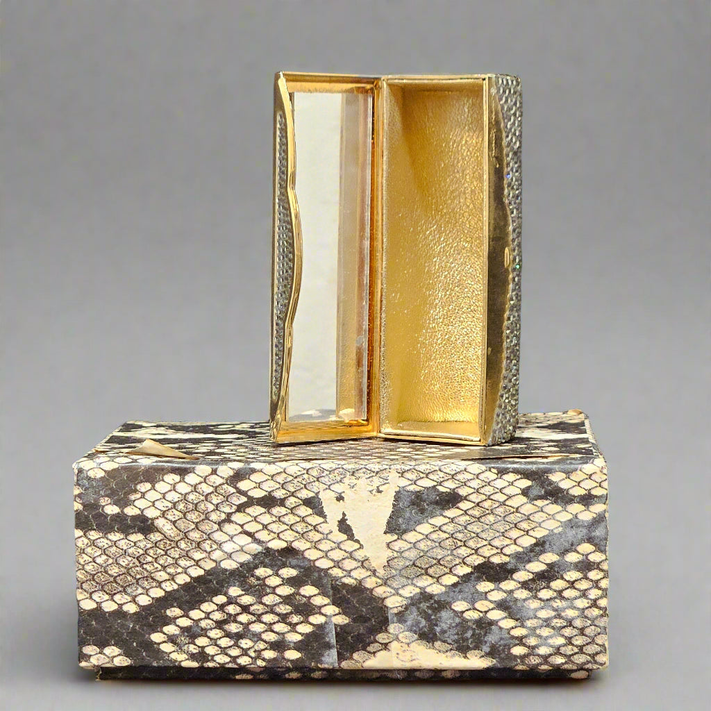 Both compacts open with a smooth snap-shut mechanism, revealing an interior mirror—ideal for lipstick touch-ups or to admire as part of a curated display. Purchased initially new at Neiman Marcus, they remain highly collectible and hard to find as a matched set.