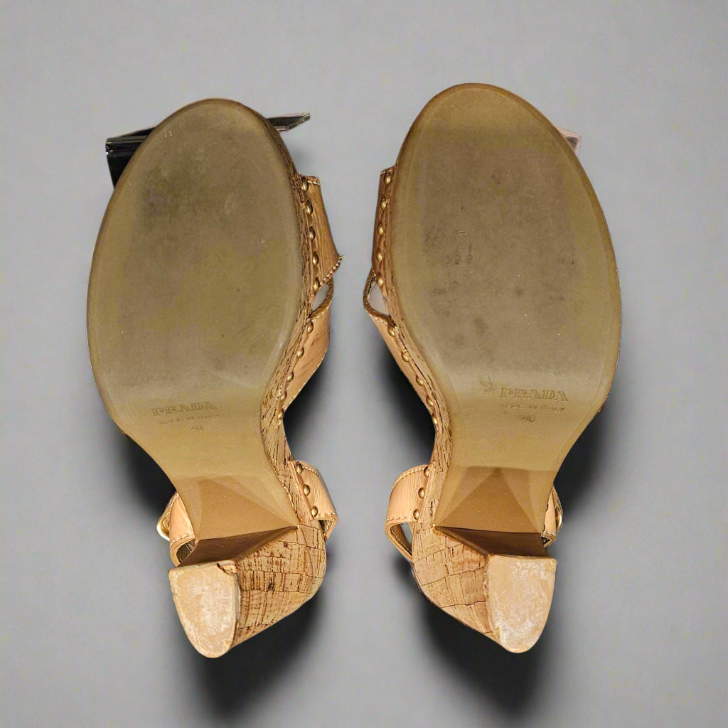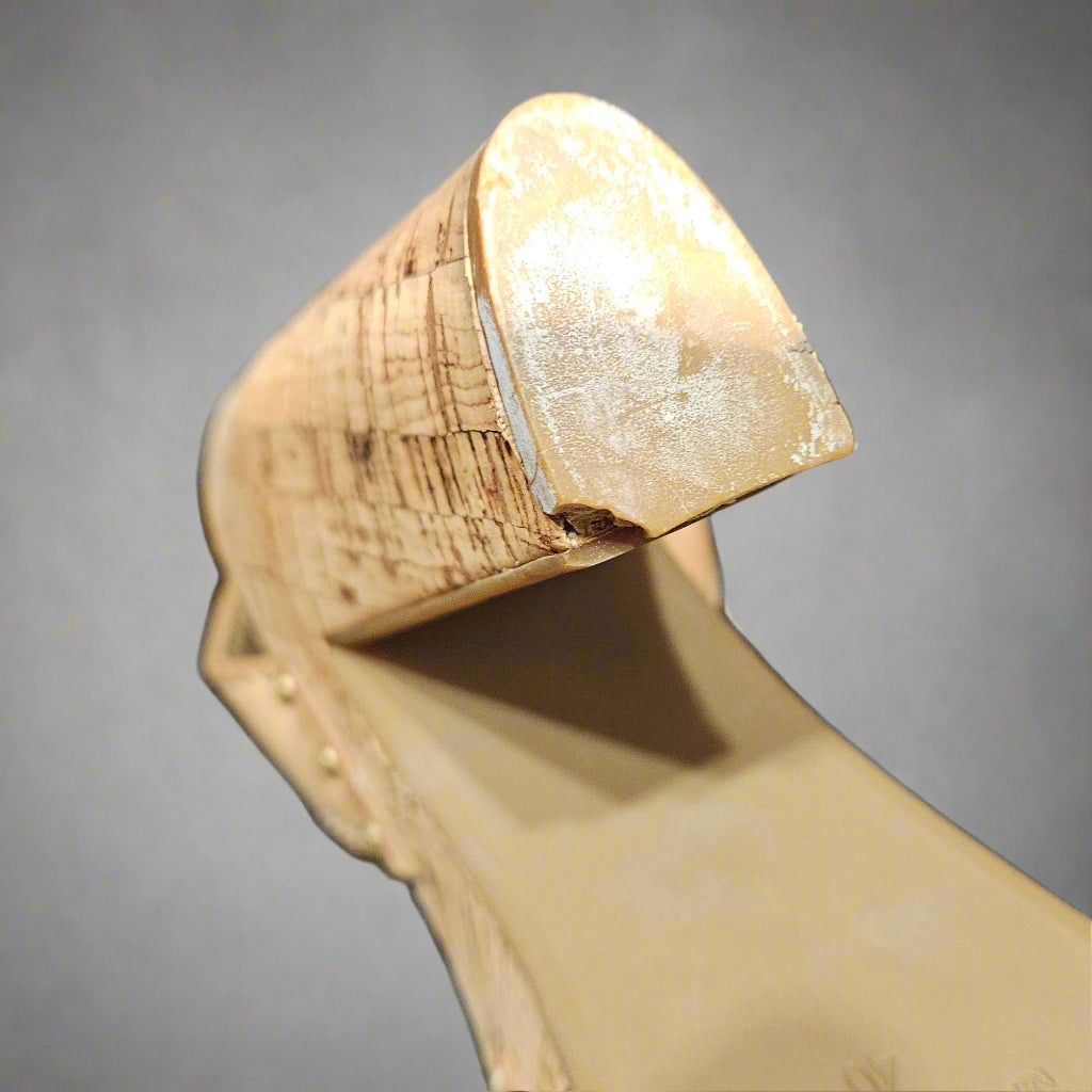 - One heel has a cracked heel foot/heel tip; this is a repairable imperfection that a cobbler can typically replace. See photo.